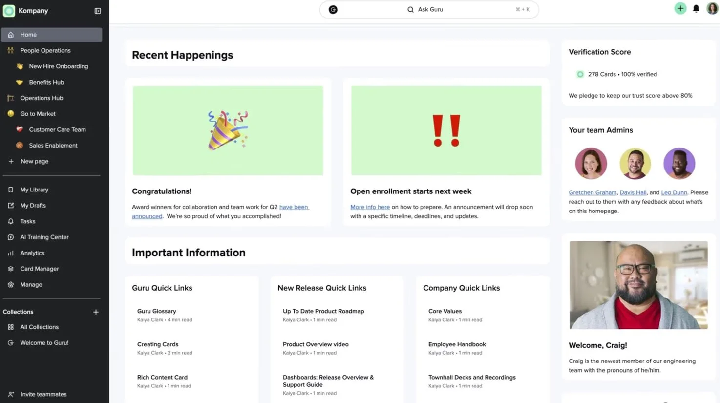 Guru is a knowledge base platform designed to surface information directly within employees’ daily workflows. It offers browser extensions and in-app cards that help teams access verified knowledge without leaving the tools they already use. Guru focuses on reducing repetitive questions by providing quick answers and context where employees need them. Its verification system prompts subject matter experts to review and refresh content regularly, which helps maintain accuracy across the knowledge base.