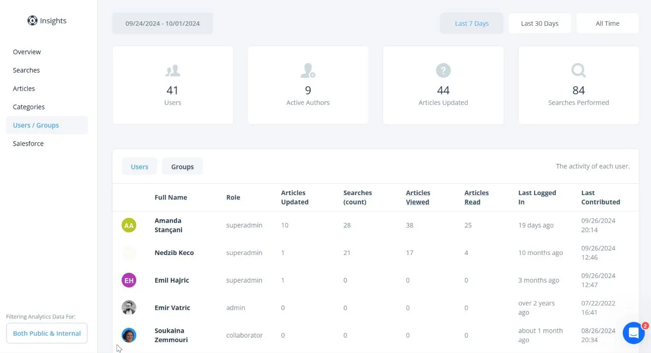 - Detailed analytics: Highlights trends to improve knowledge quality.