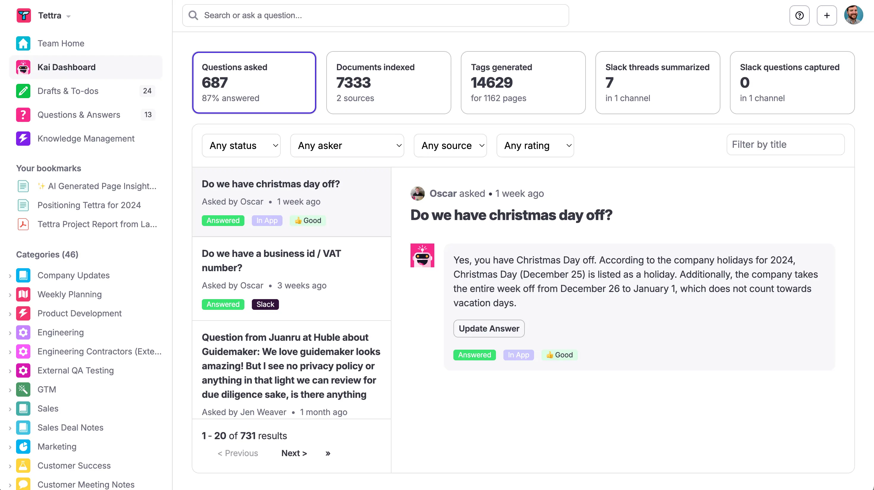 Tettra includes structured page templates, categories, and suggestions for missing content. Its verification system helps subject matter experts keep pages fresh and accurate. The platform’s lightweight approach makes it accessible for teams that want a simple system without overwhelming features.