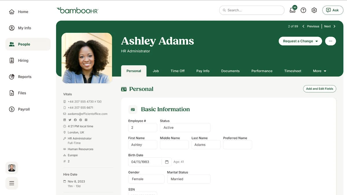 BambooHR is known for its clean interface and HR-focused approach. Its employee self-service features allow team members to access their personal records, request leave, update information, and view documents. The platform’s People Data & Analytics tools help HR teams manage employee details and track key workforce insights. BambooHR offers employee-focused self-service elements such as time tracking, performance management, and company-wide document distribution. It is designed for HR teams that want simplicity and ease of use, without heavy configuration.