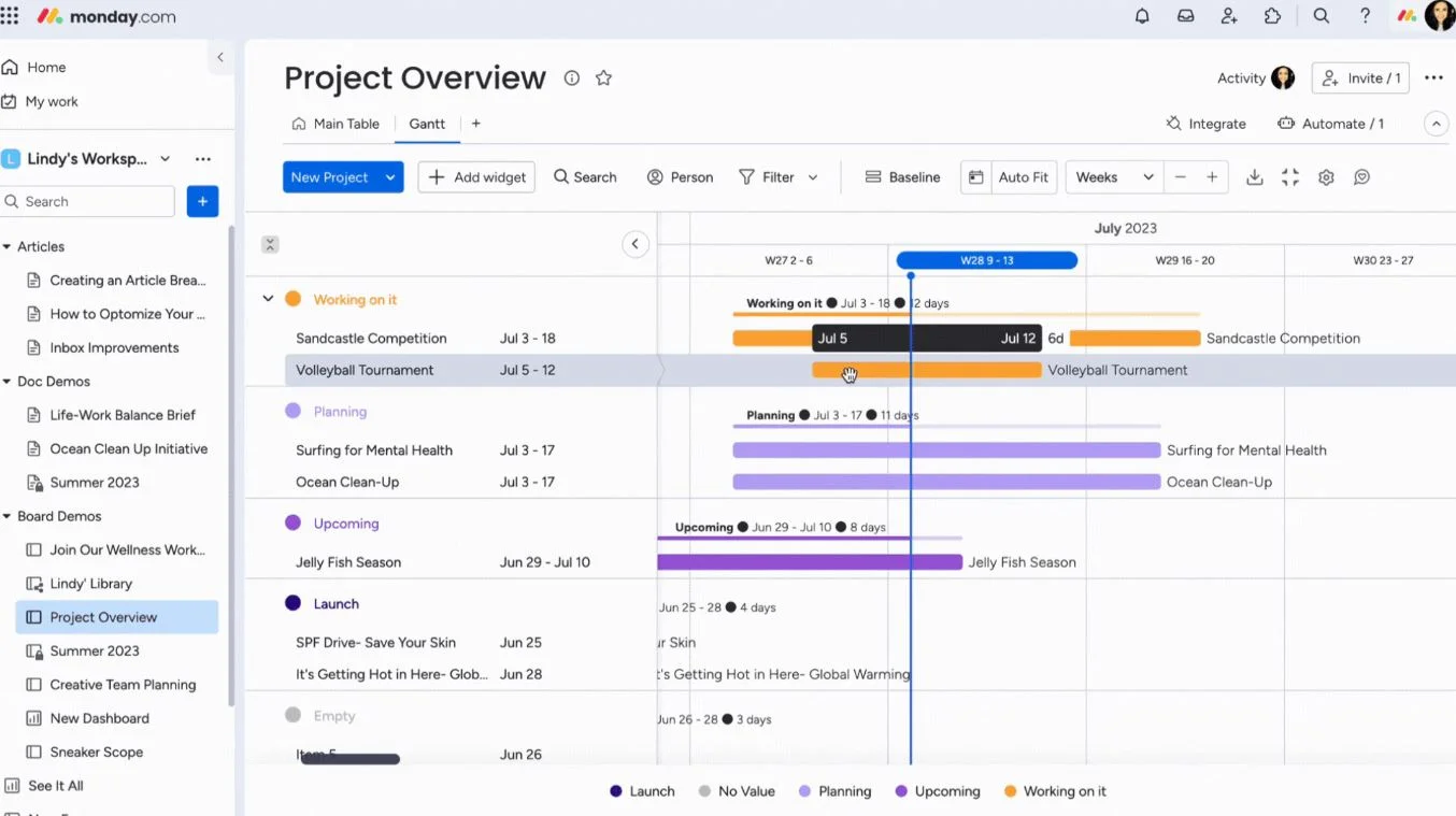 - Timeline view: Visualizes deadlines and project progress.
